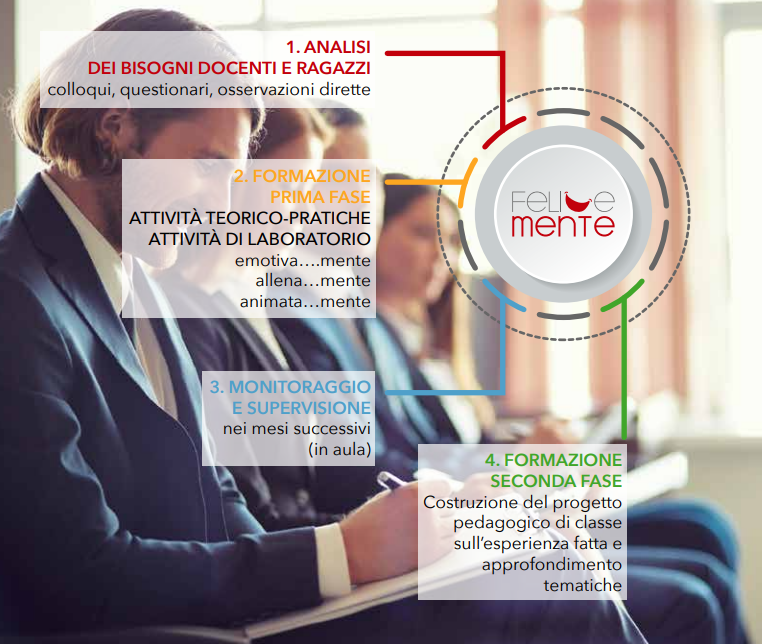 Le attività di laboratorio: emotiva…mente, allena…mente, animata…mente, l’animazione come strumento educativo. Ogni nostro percorso formativo viene proposto a partire da un’analisi dei bisogni specifici di ogni istituto. Durante la formazione ogni docente costruisce il proprio programma di Felice…mente giornaliero, settimanale e mensile da sperimentare in classe quotidianamente con l’obiettivo di creare il progetto pedagogico di classe.